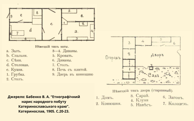 Український археолог та краєзнавець В.Бабенко, який неодноразово відвідував німецькі колонії на початку XX ст. писав: «Німецькі колонії є зразком найправильніших за розташуванням вулиць, провулків і площ містечок, влаштованих багато в чому на цілком європейський лад. Тут уже можна відрізнити головну вулицю більш широку та другорядну. Німецький тип двору набагато упорядкованіший і полягає в тому, що поряд з хатою до городу влаштовується стайня, комора та сараї, при тому часто під один дах. Криниця робиться біля воріт, що ведуть на город. Німецький будинок має сіни з одним або двома виходами, чисту кімнату, в інший бік – кухню, а іноді ж у цих приміщеннях відокремлюються спальня та їдальня. З кухні влаштовується часто особливий вхід у стайню» [1, с 8-23].